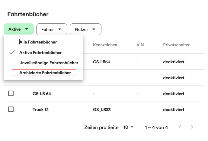 - In der Übersicht klicken Sie auf das like Dropdown-Menü und wählen das "Archivierte Fahrtenbücher" aus